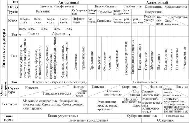 Авторская система биогенных структур [2], как было сказано выше, базируется на разработках зарубежных исследователей и предполагает деление на две большие группы: аллохтонные (биокластиты) и автохтонные (био-фитолиты).