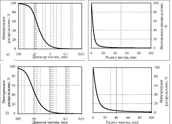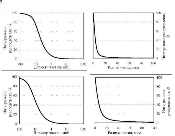 На рис.1 представлены интегральные кривые распределения для глин ГИШ-2-(02)-1 и ГИШ-2-(02)-2, которым соответствует интегральная функция распределения Ф(г), показывающая содержание (в масс. %) в суспензии частиц данного и большего радиуса.