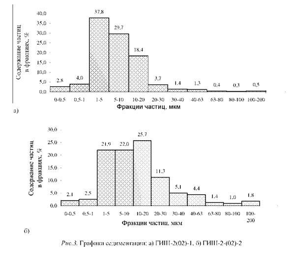 Цель данной работы - изучение гранулометрического состава глин Белгородской области месторождения Поляна ГИШ-2-(02)-1 и ГИШ-2-(02)-2. Химический и минералогический состав глин приведен в работе [4]. Показательная характеристика дисперсности глин - удельная поверхность сухой глины, выраженная в м2/г. По содержанию крупнозернистых включений размером более 0,5 мм (ГОСТ 9169-92) различают следующие группы глинистого сырья (в %): с низким содержанием включений - не более 1, со средним - от 1 до 5 и с высоким - более 5. Мелкими считают включения менее 2 мм, средними - от 2 до 5 мм и крупными - более 5 мм.