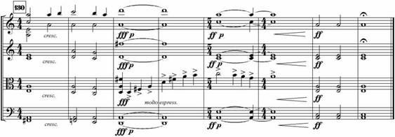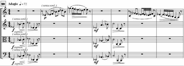 Возникает перелом в вариационном развитии, выраженный вторжением первого - патетического - мотива из вступительного раздела данной части. Он проводится дважды (по типу нисходящей по тонам секвенции) в октавной дублировке у альта и виолончели на фоне «ударных» фигур в партиях скрипок. С одной стороны, своей экспрессией, повышенным эмоциональным тонусом мелодия нижних голосов приближается к патетическим речитативам, запечатлевающим реакцию Лирического героя на некие отраженные в музыке в условной форме драматичные события. Резкий контраст двух фактурных пластов обозначает и конфликтное соотношение образов, представленных ими. С другой стороны, благодаря своей лапидарности, рельефности, укрупненной подаче (в ритмическом, синтаксическом, динамическом отношении), вступительный мотив приобретает значение начала, лежащего за пределами времени и пространства драмы. Его образ принадлежит драматургическому плану Автора, организующего процесс становления художественной формы.