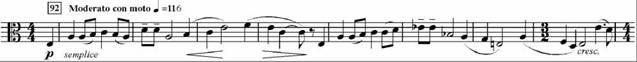 Ля-минорная тема вариаций (ц. 92-93, пример 2), изложенная у альта solo, написана в духе русских народных песен, сочетающих повествовательную размеренность и лирический тон высказывания. С другой стороны, в ней завуалированы признаки марша (равномерная поступь шага, четырехдольный размер, начальная интонация восходящей кварты, ассоциирующаяся с сигналом, фанфарой).Пример 2