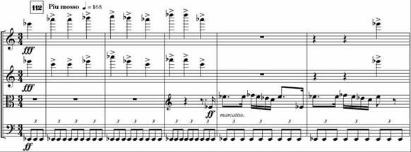 Кроме того, в данных вариациях за счет повторений однотипных ритмических и мелодических формул, громкой динамики, штриха marcato становится особо значимой такая характеристика звучания, как ударность, выступающая средством воплощения жестконаступательного, даже агрессивного начала.