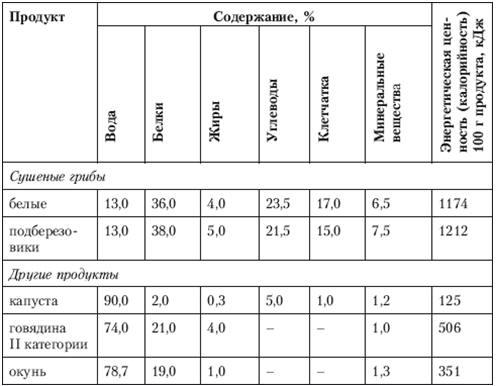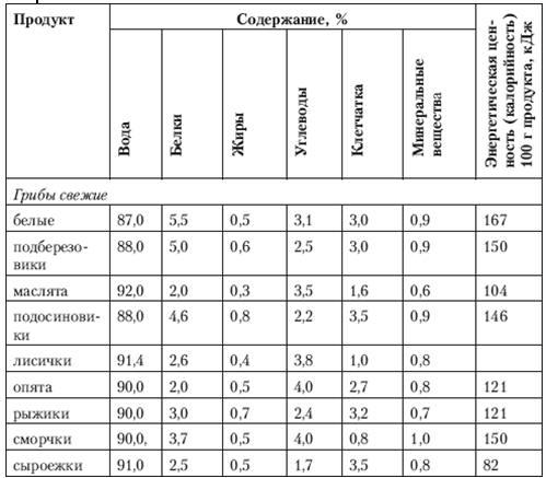 Таблица 2.3. Пищевая ценность грибов