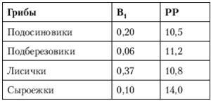 Грибы наиболее богаты витаминами группы В и прежде всего - витаминами В1,В2 и РР (табл. 2.4). Так, в желтых лисичках витамина В1 почти столько же, сколько в говяжьей печени.