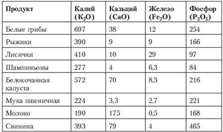 Из минеральных веществ в грибах особенно много калия, фосфора и железа, столь необходимых для организма человека и нередко отсутствующих в других продуктах (табл. 2.5).