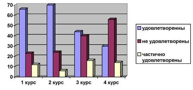 На 1, 2 и 3 курсах процент удовлетворенности процессом обучения предельно высок, на 4 курсе этот процент немного ниже.