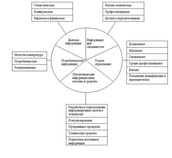 Понятие информационного продукта и информационной услуги. Классификация информационных продуктов и услуг. Жизненный цикл информационного продукта. Экономика информационных сетей. Методы управления производством и распределением информационных продуктов. Методы анализа и оценки качества информационных продуктов и услуг. Основные секторы информационной сферы: информация, электронные коммуникации, тематическая классификация. Сектор деловой информации. Сектор информации для специалистов. Научно-техническая информация. Другие виды профессионально ориентированной информации. Социально значимая (правовая, социальная, политическая, экологическая, образовательная и др.) информация.