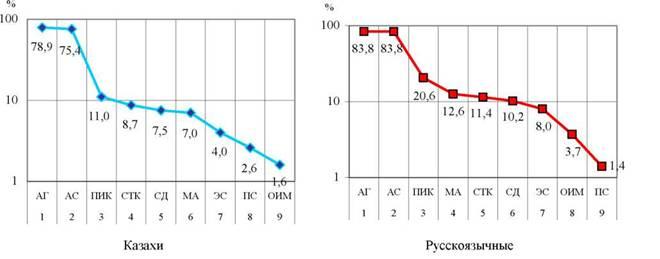 Анализ ранговой структуры распространенности отдельных патогенетических факторов у мужчин выявил, что независимо от этнической принадлежности три первых места в указанной последовательности занимают АГ, АС и ПИК. Различия в распространенности остальных шести патогенетических факторов у больных казахской и русскоязычной субпопуляций наглядно видны на рис.4.
