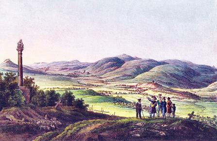 Впервые Кульмское поле сражения было изображено участником события - офицером лейбгвардии гусарского полка А. И. Дмитриевым-Мамоновым6, состоявшим тогда адъютантом А. П. Ермолова. Этот рисунок входит в серию, посвященную кампаниям 1812-1814 годов и позже (1818-1822) литографированную художником Военнотопографического депо С. П. Шифляром7. Рисунок выполнен во второй день сражения, то есть 18 августа 1813 года, с возвышенного места позади позиции русских войск, запечатленной на переднем плане. На среднем плане - постройки селения Пристен, далее - дымы от выстрелов французских пушек, а за ними - селение Кульм, левее которого возвышается гряда, увенчанная часовней Святой Троицы. Во время битвы здесь находился штаб Вандамма. За часовней - дорога, плавно огибающая горный склон и скрывающаяся в лесу; она ведет к перевалу в селе Ноллендорф, церковь которого видна на вершине в левой верхней части изображения. Следует отметить, что расстояние от Пристена до этой церкви составляет по прямой 8 километров, а перепад высот - 460 метров8.
