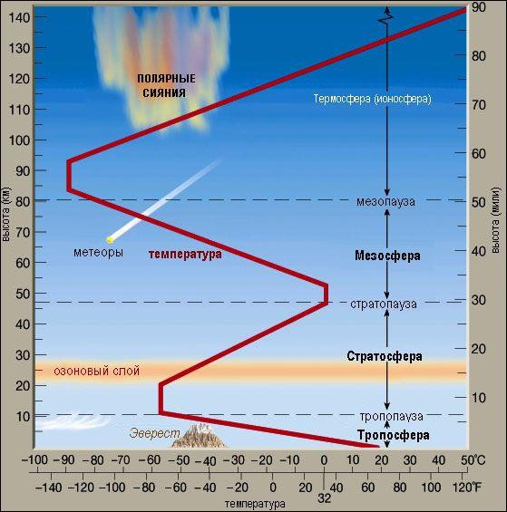 Добавлю еще две картинки для иллюстрации строения атмосферы. Первая, правда, на немецком, но зато полная и достаточно легка в понимании . Ее можно увеличить и хорошо рассмотреть. Вторая показывает изменение температуры атмосферы с высотой.