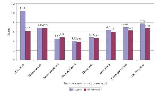 Результаты диагностики особенностей межличностных отношений лидеров и не лидеров представлены графически на рис. 2 и свидетельствуют о том, что: