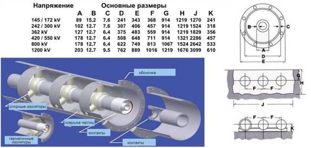и составляет 6,5-7,6 мм. Более точный выбор габаритов ГИЛ осуществляется по специальным методикам, учитывающим состав газа и его давление, передаваемую мощность, различные конструктивные особенности. Максимальная передаваемая мощность, в свою очередь, зависит от того, находится ли газоизолированная линия в земле, на поверхности земли или в туннеле.