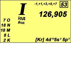 Йод – химический элемент VII группы периодической системы Менделеева. Атомный номер - 53. Относительная атомная масса 126,9045 (рис. 1). Галоген. Из имеющихся в природе галогенов – самый тяжёлый, если, конечно, не считать радиоактивный короткоживущий астат. Практически весь природный Йод состоит из атомов одного – единственного изотопа с массовым числом I