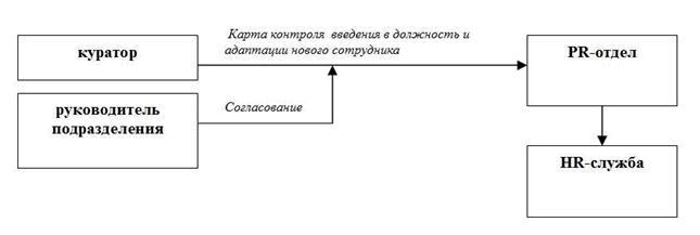 Куратор заполняет карту контроля введения в должность нового работника (проставляет сроки, назначает ответственных, ставит отметки о выполнении каждого мероприятия), которую затем передает руководителю подразделения (приложение №3).. Копии документов передаются в кадровую службу для контроля за правильностью введения нового сотрудника в должность и его адаптацией, для ведения статистики