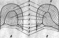 Рис. 12. Три основных типа пальцевых узоров (Л) и их «семейное древо» (В)