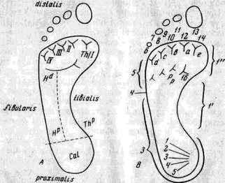 Подошвенные подушечки, поля и трирадиусы, за небольших исключением, по расположению и количеству аналогичны ладонным (рис. 15). На подошве также различают дистально (distalis) и проксимальное (proximalis) направления, но радиальному на ладони здесь соответствует тибиальное (tibialis) а ульнарному—фибулярное (fibularis) направление. Тенар/ классифицируется на подошве как подушечка большого пальца (Hallucal), или дистальный тенар (Thd).