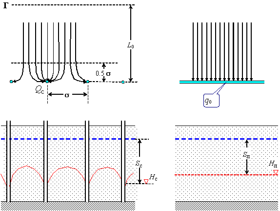 | Рис. 1. Схема притока к линейному водозаборному ряду и к эквивалентной траншее |