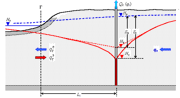 Для простоты построения расчетных формул будем считать , что фактически не так, однако принципиального значения это не имеет. Режим фильтрации - стационарный, так как при работе водозабора происходит инверсия русловой разгрузки естественного потока и в принципе возможно формирование привлекаемого потока из реки.