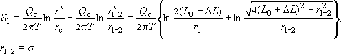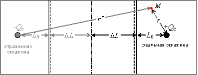 где - радиальная координата точки относительно реальной скважины, - то же относительно отраженной скважины. Соответственно для "собственного" понижения в действующей скважине (т.е. при расположении точки M на ее стенке):
