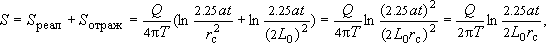 Использование приема зеркальных отражений должно быть известно студентам из курса "Гидрогеодинамика". В данной ситуации применяется зеркальное отражение скважины с тем же (по величине и знаку) дебитом относительно непроницаемого граничного контура, что обеспечивает сохранение на нем условия нулевого трансграничного расхода (нулевой градиент напора по нормали к границе в силу симметрии реальной и отраженной депрессионных воронок). Понижение в реальной скважине рассчитывается по принципу сложений решений: