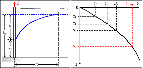 Проведя минимум три ступени откачки с разными дебитами, получаем возможность определить прямо с графика коэффициенты прямой и . После этого для прогноза понижения при заявленном дебите решаем квадратное уравнение: