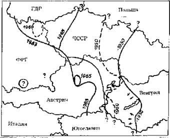 Расселение черного аиста в Средней Европе в 1940-1983 гг. Стрелками показано недостоверное положение границы ареала в Венгрии (по: Sackl, 1985).