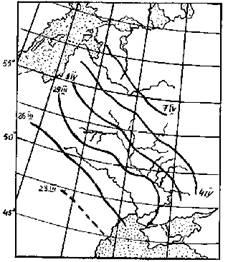 Считалось, что эта неравномерность проявляется, в основном, благодаря особенностям рельефа, а на равнине, вдали от гор и морских побережий, изофены будут идти более или менее равномерно. Но еще А.А. Браунер установил, что одни и те же виды прилетают на севере Украины раньше, чем в Бессарабии и Причерноморье. Это связывалось с миграцией их по разным пролетным путям (Пузанов, 1957). Г. Гроте обратил внимание на то, что в Аскании-Нова птицы появляются на 2 недели позже, чем на Черноморском побережье и на Днепре, где пролетет основная масса водоплавающих (Соколов, 1926). К. Бречер (1935) установил, что кукушка в Средней Европе быстрее продвигается вдоль рек, даже на равнине. У. Сливинская (1938) пишет, что ход изопиптез может зависеть не только от особенностей ландшафта, но и от пути пролета птицы. Постепенно с появлением более крупномасштабных фенокарт эта мысль углубляется и развивается. На картах С.И. Хомченко (1972) по прилету кукушки (Cuculus canorus) на юге Западной Сибири изофены образуют глубокие выступы, которые он называет "путями проникновения" (рис. 2). М.А. Родионов (1978) писал, что птицы вырываются вперед по экологическим руслам пролета. И, наконец, В.В. Серебряков (1978) предложил определять по авифенологическим картам пролетные пути.