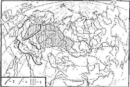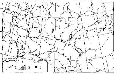 Рис. 1. Гнездовой ареал розового скворца в Восточной Европе по данным Е.П. Спангенберга (1954) и в настоящее время (Костин, 1983; Белик, 1993 и др.): 1 — северная граница ареала в первой половине XX в.; 2 — предельная граница пульсации ареала в 1980-е гг.; 3 — место постоянного гнездования в Крыму.
