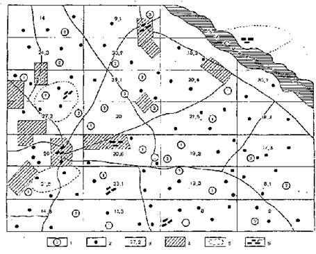 Рис. 4. Распределение жилых и брошенных гнезд степного орла в 1956 г. на Сарпинской низменности на участке 35 х 50 км, на следующий год после уничтожения сусликов фосфидом цинка (по: Семенов и др., 1959): 1 — жилые гнезда и количество яиц в кладках, 2 — брошенные гнезда, 3 — обилие сусликов в особях/га в среднем по отдельным клеткам, 4 — распаханные земли, 5 — районы скоплений холостых степных орлов, 6 — посёлки и дороги.