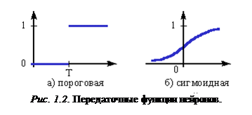 (рис.1.1). Он состоит из элементов трех типов. Элементы нейрона - умножители (синапсы), сумматор и нелинейный преобразователь. Синапсы осуществляют связь между нейронами, умножают входной сигнал на число, характеризующее силу связи, - вес синапса. Сумматор выполняет сложение сигналов, поступающих по синоптическим связям от других нейронов, и внешних входных сигналов. Нелинейный преобразователь реализует нелинейную функцию одного аргумента - выхода сумматора. Эта функция называется "функция активации" или "передаточная функция" нейрона. Нейрон в целом реализует скалярную функцию векторного аргумента.