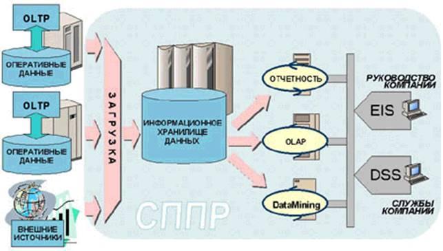 СППР состоят из двух компонент: хранилища данных и аналитических средств. Хранилище данных предоставляет единую среду хранения корпоративных данных, организованных в структурах, оптимизированных для выполнения аналитических операций. Аналитические средства позволяют конечному пользователю, не имеющему специальных знаний в области информационных технологий, осуществлять навигацию и представление данных в терминах предметной области. Для пользователей различной квалификации, СППР располагают различными типами интерфейсов доступа к своим сервисам.