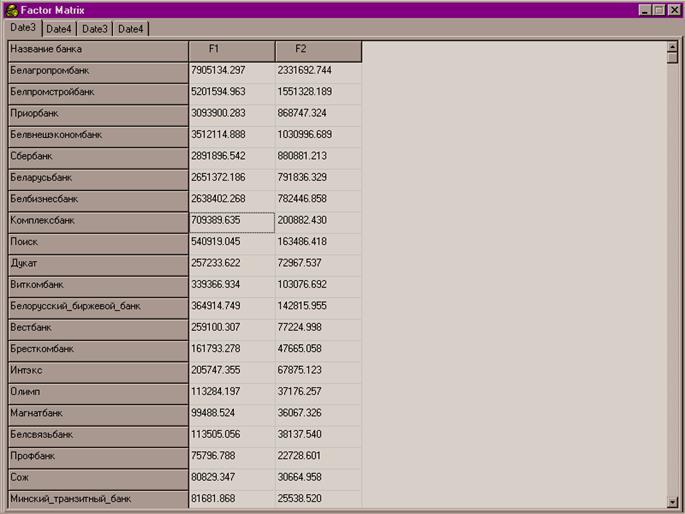, получим окончательную матрицу, показывающую расположение банков в новых координатах (факторах F1