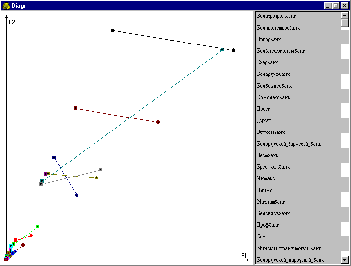 4. По желанию пользователя может быть построен график, показывающий положение банков на факторной плоскости и динамику их развития во времени (см. приложение 5).