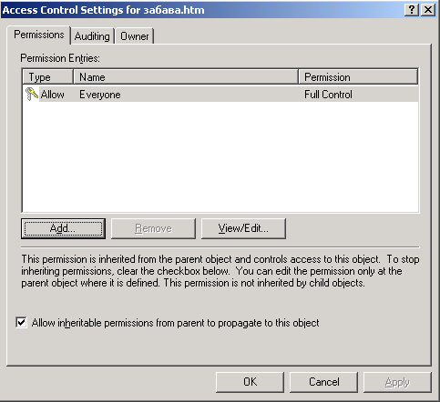3. На вкладке Permissions (Разрешения) в диалоговом окне Access Control Settings Reset Permissions On AllChild Objects And Enable Propagation Of Inheritable Permissions (Установить разрешения для всех дочерних объектов и разрешить их наследование) и щелкнуть на кнопке ОК.