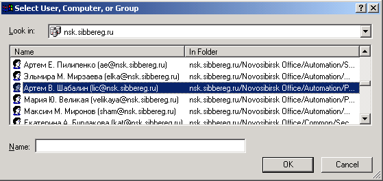 3. Если следует присвоить разрешение пользователю или группе, которые отсутствуют в списке Name (Имя), следует щелкнуть на кнопке Add (Добавить), чтобы появилось диалоговое окно Select Users, Computers, Or Groups (Выбор: Пользователи, Компьютеры или группы). Затем выделить нужного пользователя или группу, щелкнуть на кнопках Add (Добавить) и ОК(см.рис.3).