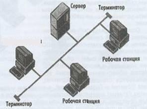 В случае реализации шинной структуры все компьютеры связываются в цепочку. Причем на ее концах надо разместить так называемые терминаторы, служащие для гашения сигнала. Если же хотя бы один из компьютеров сети с шинной структурой оказывается неисправным, вся сеть в целом становится неработоспособной. В сетях с шинной архитектурой для объединения компьютеров используется тонкий и толстый кабель. Максимальная теоретически возможная пропускная способность таких сетей составляет 10 Мбит/с, Такой пропускной способности для современных приложений, использующих видео- и мультимедийные данные, явно недостаточно, Поэтому почти повсеместно применяются сети с звездообразной архитектурой.