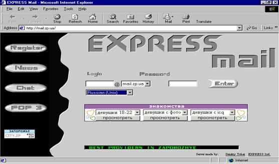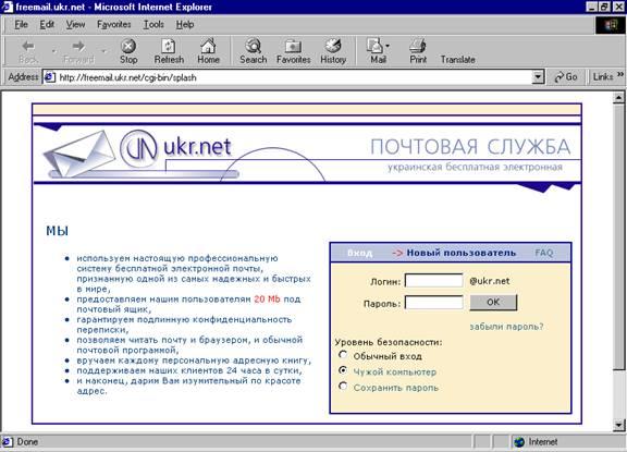 http://www.freemail.com.ua/ Служба бесплатной почты "Freemail" - развитие службы бесплатной почты "Inet". Возможность получения почты по протоколам POP3 и IMAP. Размер ящика не более 3Mb. Почтовый сервер корректно работает с любыми кодировками - windows-1251, KOI-8R, ISO, UNICODE... При работе с почтовой службой, ваша информация шифруется. К каждому письму, приходящему на ваш адрес, автоматически роботом будет добавляться рекламный текст объемом не более 5 строк. Содержание рекламы будет определяться администрацией фирмы "Адамант".