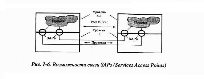 осуществляется посредством интерфейса, построенного на основе спецификаций служб. Верхний уровень является «пользователем служб» (SU, ServiceUser), а нижний - их «поставщиком» (SP, ServiceProvider). Обмен информацией между уровнями осуществляется в точках доступа к службе (ServiceAccessPoints, SAP), причем элемент более высокого уровня может обращаться к элементу более низкого уровня. Это важно, если, например, нужно соединить уровни с помощью другого пути, что достигается выбором специальных SAP.