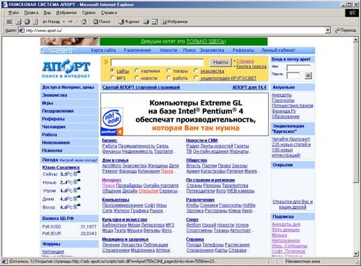 Благодаря индексированию ссылок (что требует небольшого дополнительного времени) поисковое пространство Апорта значительно расширяется. Апорт не только быстро добирается до различных закоулков российского Интернета, но и позволяет искать в зарубежной Сети, причем весьма неплохо (поскольку на многие интересные зарубежные ресурсы есть ссылки и с российских сайтов).