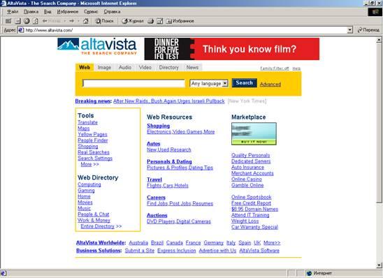 Одна из наиболее популярных поисковых систем Altavista Search появилась в декабре 1995 года и быстро приобрела самостоятельное значение как эффективное и мощное средство поиска.