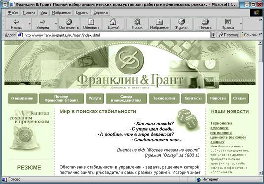 http://www.franklin-grant.ru/ru/main/index.shtml - сайт, на котором можно найти весь спектр передовых технологий финансового менеджмента, которые позволяют управлять финансовыми рисками и оценивать доходность в самых разных сферах бизнеса: фондовый рынок, страхование, инвестирование, корпоративное управление, банкинг.