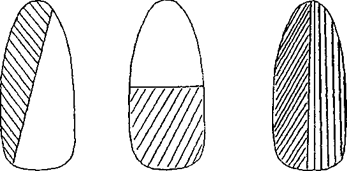 13. «Малахит». Самый сложный и один из самых красивых рисунков (в результате получается эффект змеиной кожи). Все лаки этой композиции должны быть различных оттенков, но в одной цветовой гамме. На основу нанесите несколько горизонтальных дугообразных полосок. Иголочкой проведите несколько линий из одной точки снизу вверх (рис. 15).