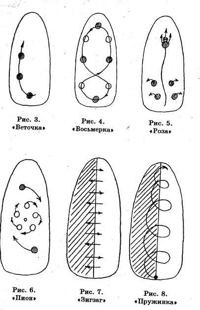 6. «Пружинка». И у этого рисунка в основе лежит двухцветный дизайн. Только переплетать лаки следует снизу вверх, как бы рисуя пружинку (рис. 8).