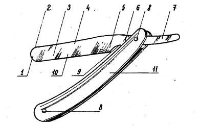 Опасные бритвы состоят из двух основных частей — ручки и клинка, которые соединены между собой заклепкой. Ручка опасной бритвы, изготовленная из пластических масс или из дерева, служит одновременно и футляром для предохранения жала клинка от затупления. Она состоит из двух половинок, скрепленных на концах заклепками.