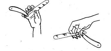 4. Расческу держат левой рукой, причем одна из торцовых сторон ее упирается в ладонь. Ее держат двумя пальцами — большим и указательным. Большой палец располагается вдоль обушка, а указательный напротив, на зубьях. Этот способ держания расчески используется, в основном, при стрижке.
