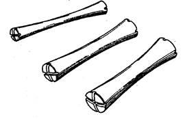 Коклюшки для горизонтальной химической завивки по устройству однотипны и различаются лишь размерами (рис. 12). Изготовляются они из дерева или пластмассы. Длина коклюшек от 6 до 10 см. Диаметр средней части коклюшки в 1,5-2 раза меньше, чем диаметр средней части около 3 мм, самые толстые — 10—12 мм.