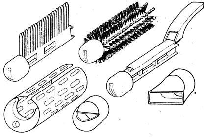 Для выполнения различных операций при сушке или укладке волос имеются специальные насадки, которые можно легко менять во время работы. Наконечники подразделяются на виды: в форме расчески, щетки, плойки, сопла. (рис. 13).