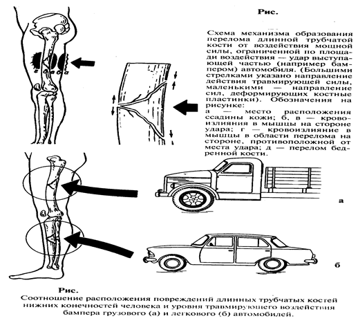 При ударе бампером или иными выступающими частями автомобиля по ногам человека возникают значительные кровоизлияния в мягкие ткани, в частности в мышечную ткань, и так называемый бампер-перелом (рис)