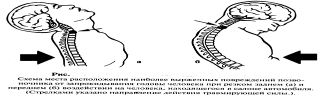 При неожиданном ударе автомобилем непосредственно по телу жертвы или автомобилем по автомобилю у жертв происшествия возникают повреждения шейного отдела позвоночника от резкого его сгибания или разгибания.