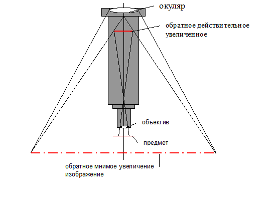 Преодолеть эту трудность помогла одна простая идея, автором которой был Левенгук еще в 19 в. Идея понятна из рис.3. Для получения больших увеличений надо использовать сразу две линзы. Одна из них - объектив - дает действительное обратное увеличенное изображение объекта, а вторая – окуляр – используется как лупа. Рассматривая через окуляр картину, полученную с помощью объектива, мы видим увеличенное мнимое изображение объекта. Таким образом, большое увеличение достигается в две ступени, и в результате в микроскопе возникает обратное (перевернутое) по отношению к объекту изображение.